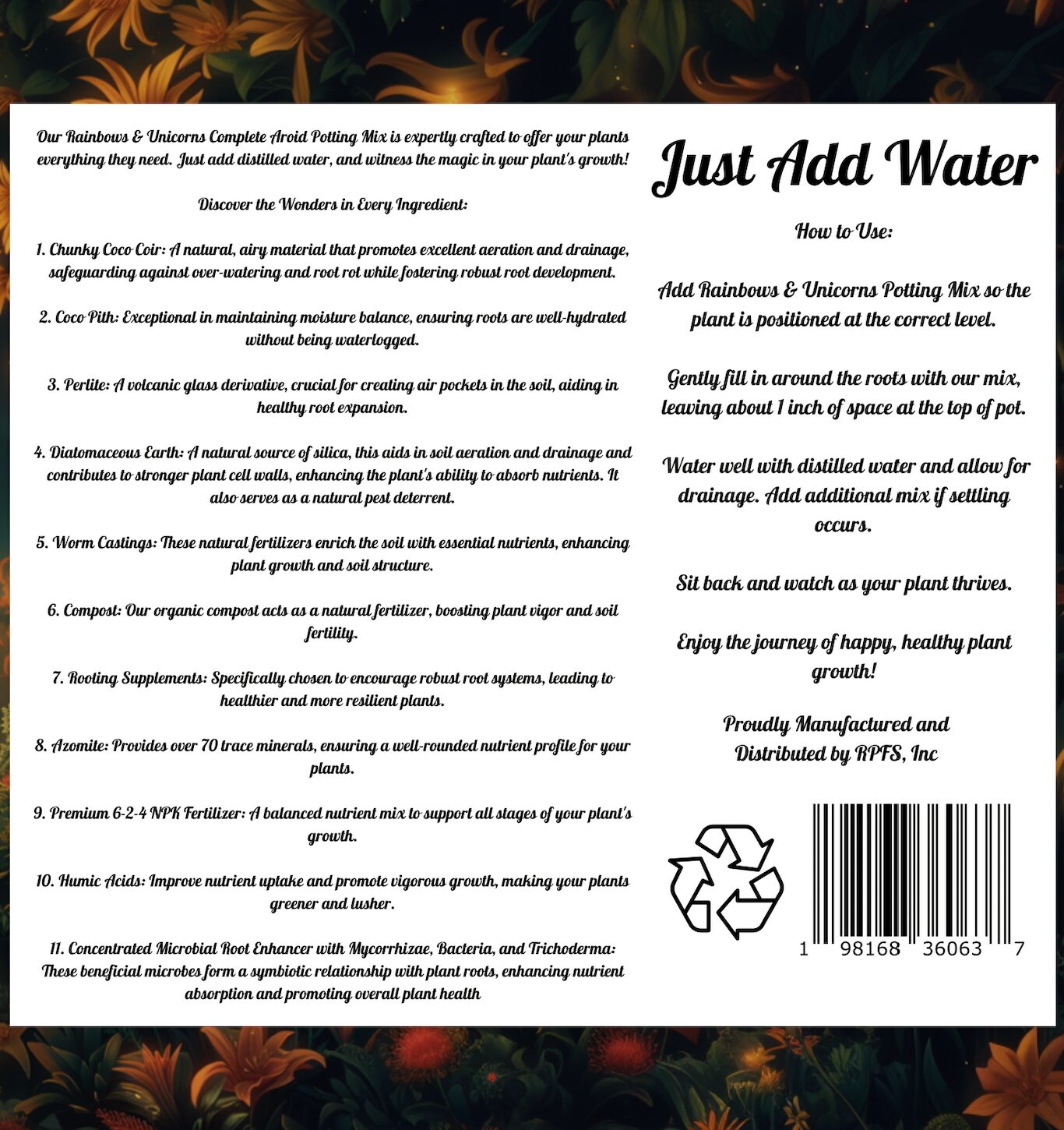 Rainbows & Unicorns Aroid Potting Mix is produced by RPFS, Inc. using a carefully selected ingredient profile designed to support healthy root growth, stable structure, and consistent performance for aroids and tropical plants.